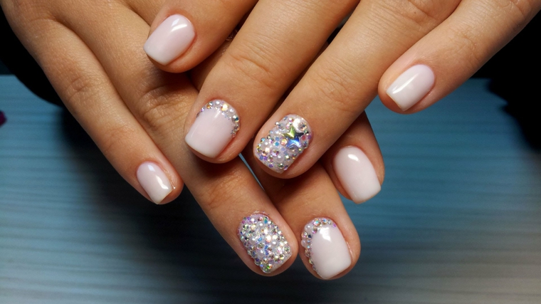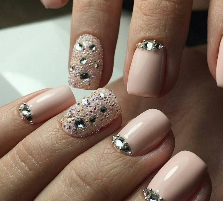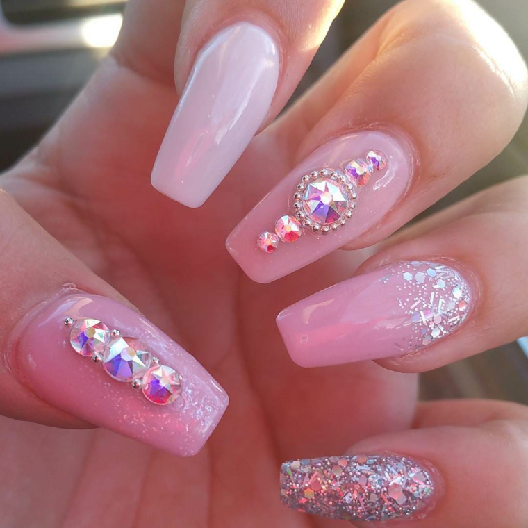 Decorazioni unghie con brillantini su una base rosa glossy